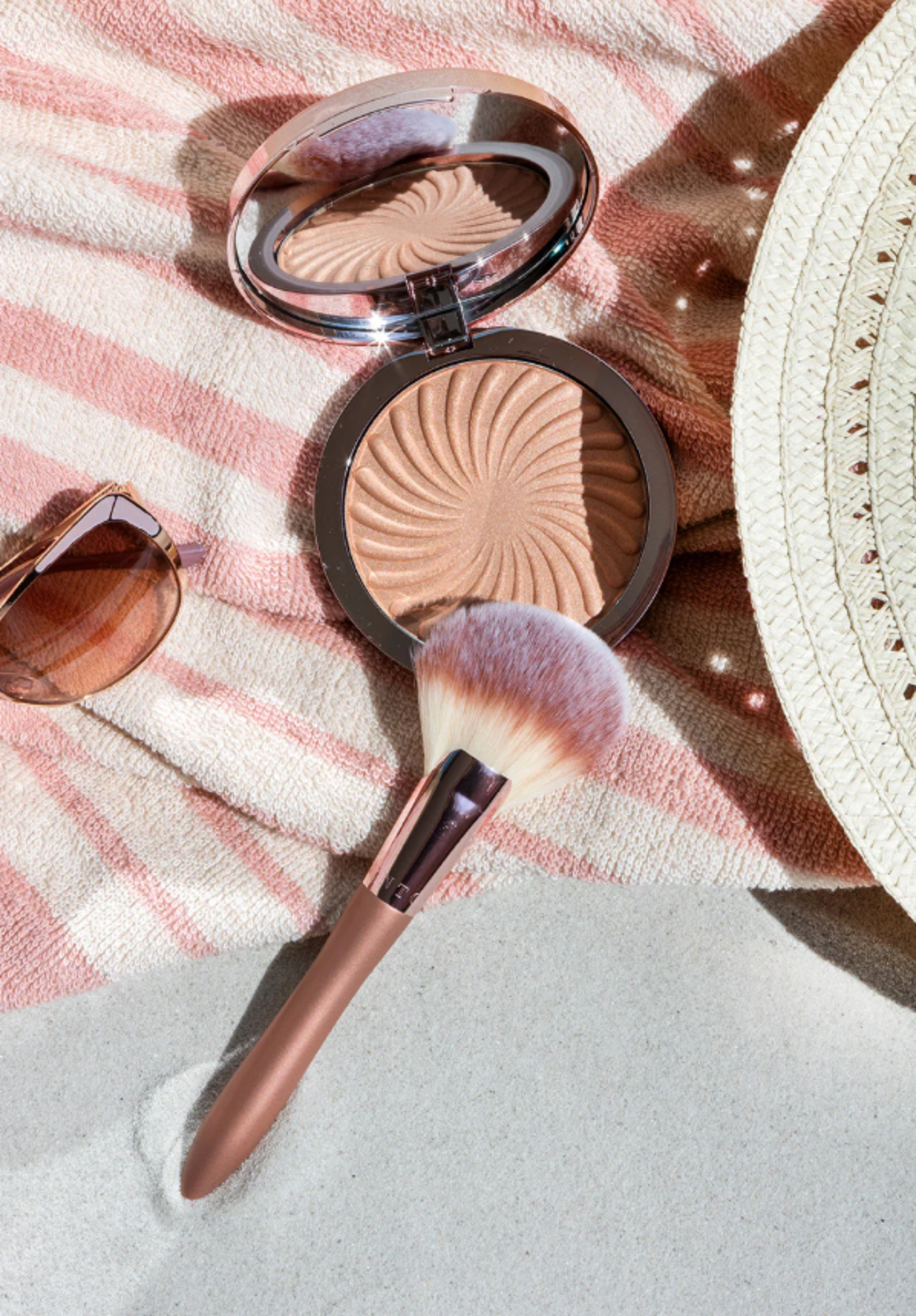 Applica la polvere con il Big Fan Brush sulla fronte, sugli zigomi e sotto la mascella per un effetto abbronzato. Se utilizzi la polvere su tutto il viso, è meglio usare il Big Powder Brush.